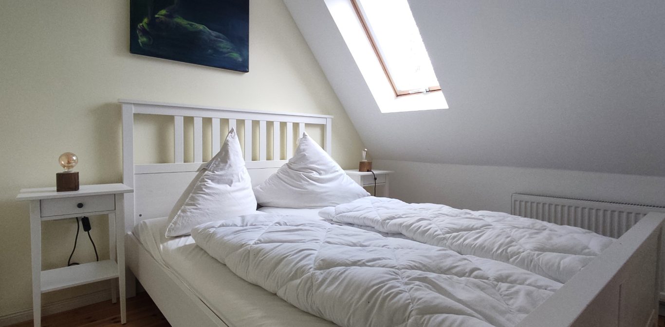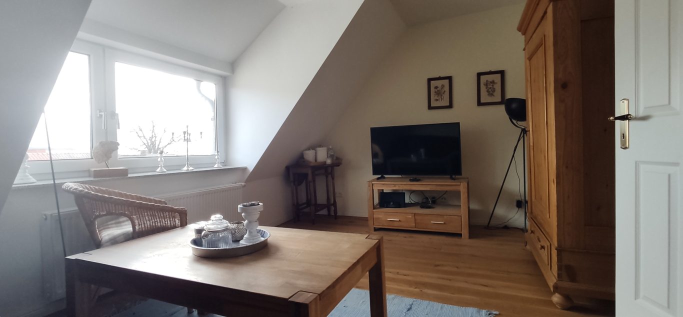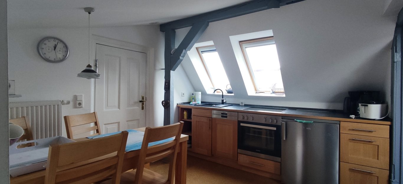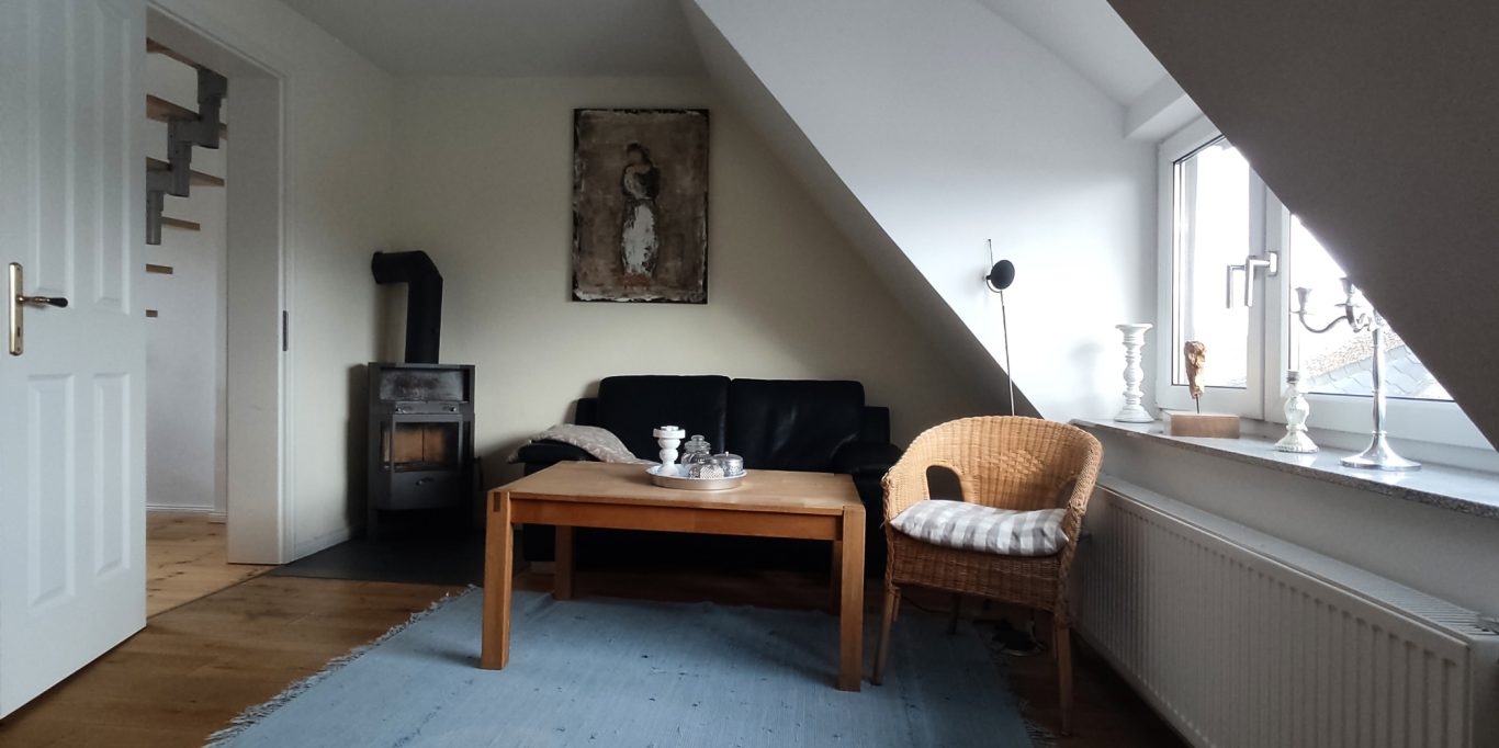 Die Fewo befindet sich im OG des Hauses, erstreckt sich über 2 Etagen und bietet Platz für 3 Personen. In der unteren der 2 Etagen finden Sie den großzügig gestalteten Wohnraum, die offene Küche und 1 Schlafzimmer mit Doppelbett, sowie das Badezimmer mit Dusche. Im Spitzboden finden sie das zweite Schlafzimmer mit französischem Bett, was bei Kindern sehr beliebt ist. Achtung! ungeeignet für Kleinkinder!